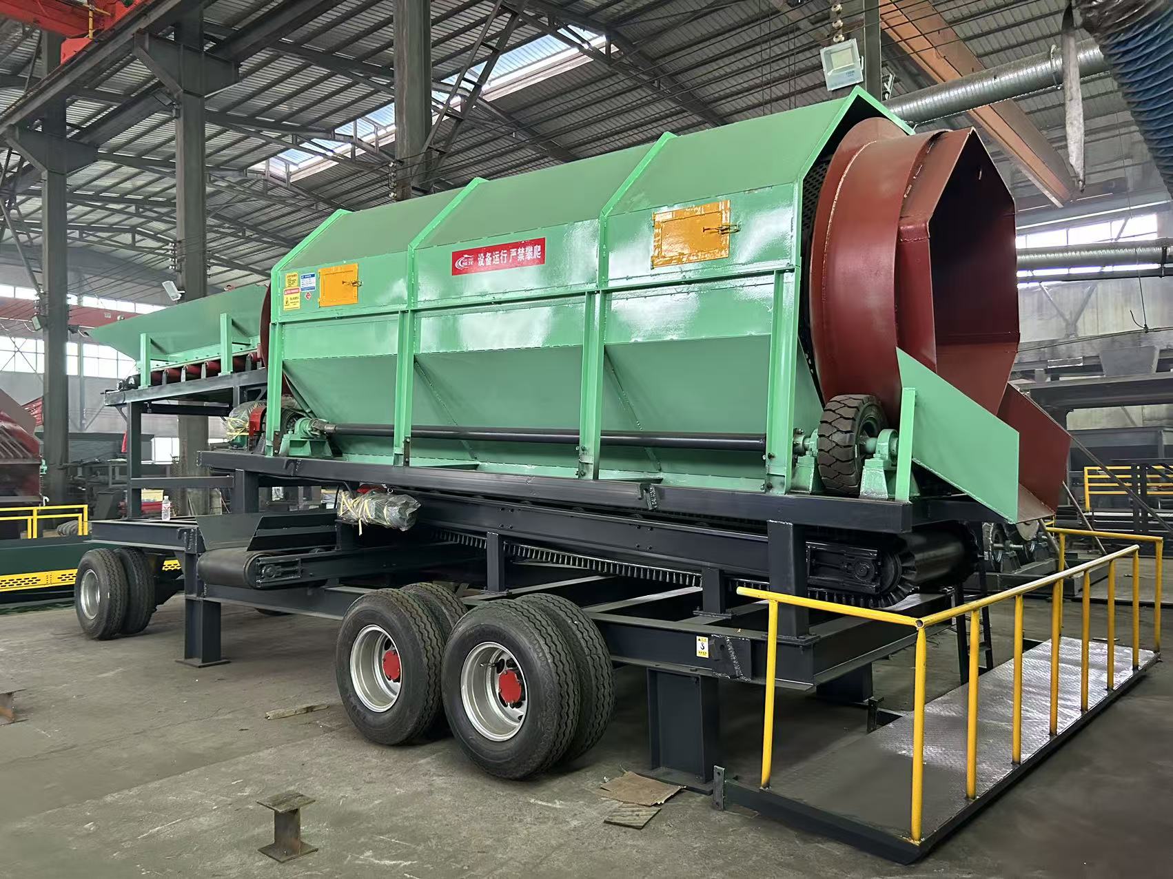 傳統(tǒng)固定篩分設(shè)備安裝復(fù)雜、靈活性差,而普通有軸滾筒篩在處理濕黏物料時(shí)易出現(xiàn)軸卡料、篩網(wǎng)堵塞等問題。移動(dòng)式無軸滾筒篩結(jié)合了“可移動(dòng)底盤”與“去軸結(jié)構(gòu)”,實(shí)現(xiàn)了快速轉(zhuǎn)場、即停即用、快速防堵三大優(yōu)勢(shì),特別適用于施工現(xiàn)場、礦山野戰(zhàn)線、建筑垃圾臨時(shí)處理站等場景。